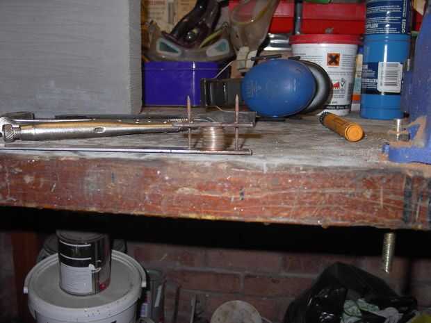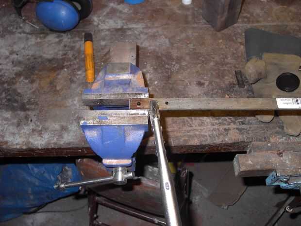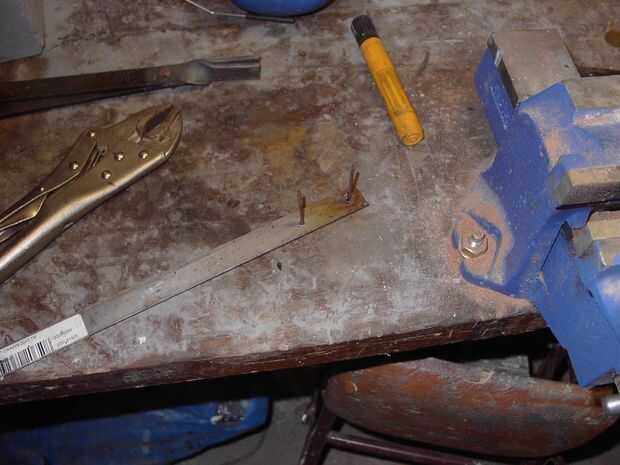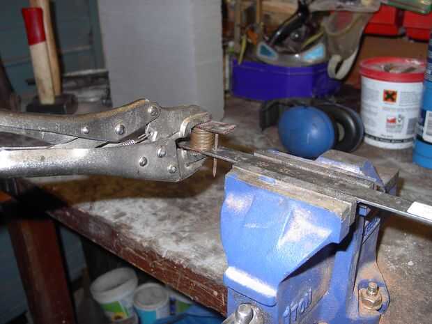 Para hacer las placas de presión, conseguir algunos correa de acero fino o tira, como quiera llamarlo, (B + Q para los lectores de UK) y cerca de 2,5 pulgadas del extremo. Lo vuelva a colocar la tira de acero y perfore agujeros para remaches recorrer. Creo que las imágenes lo explican mejor. Después tienes los platos perforados, montar una pila de alternarse metales. Los metales que utilizan deben tener similares características de trabajo y puntos de fusión.