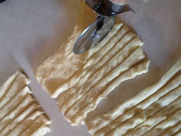 Abrir su lata de masa rodillo crescent y desentrañar los rectángulos. Si usted tiene triángulos en lugar de rectángulos sólo podría costura juntos para hacer un rectángulo. Corte tiras de la masa con el cortador de pizza o un cuchillo. Hacer esto hasta que te quedas sin pasta.