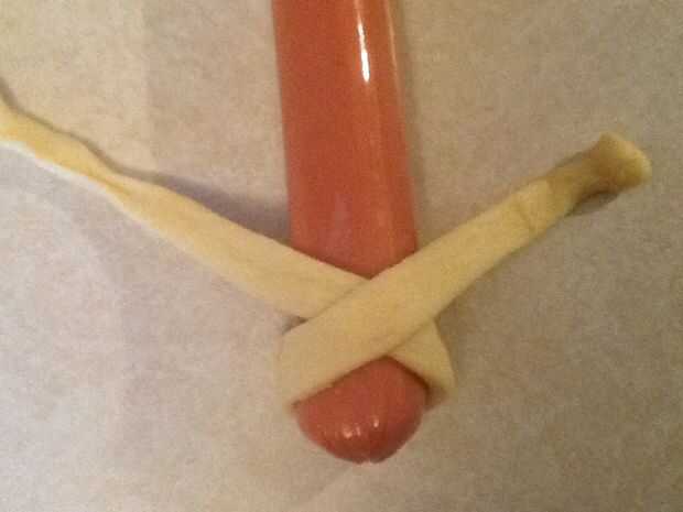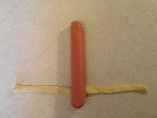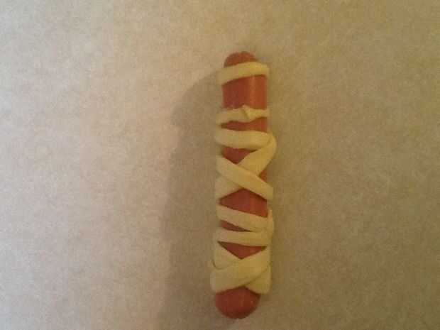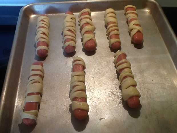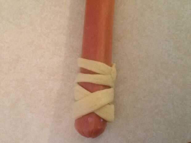 Tomar una tira de la masa rodillo crescent y coloque el extremo de un perrito caliente sobre él. No hay una manera específica para él, sólo a mano alzada. Deja una pequeña abertura en la parte superior del perro caliente para los ojos. Una vez que han todos sus perritos calientes rociarlas ligeramente con spray de cocina. A continuación, les Hornee a 375 grados F durante 7-10 minutos.