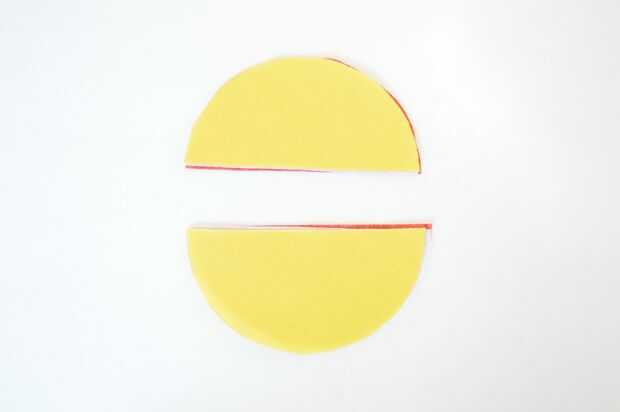 Tomar un conjunto de las piezas del círculo (1 amarillo con entretela y 1 pieza rojo) y cortar por la mitad con unas tijeras de tela.