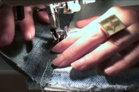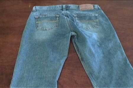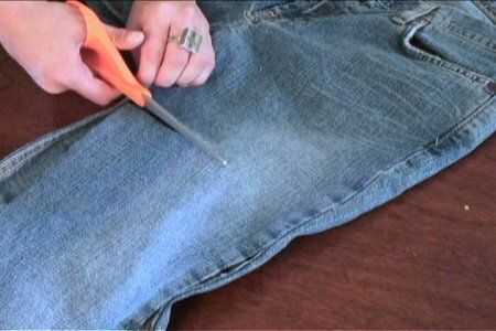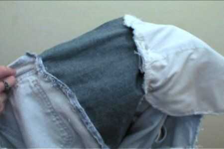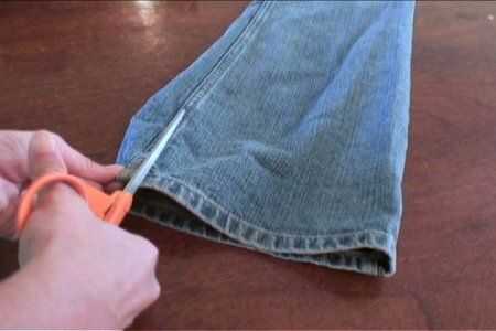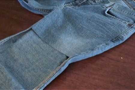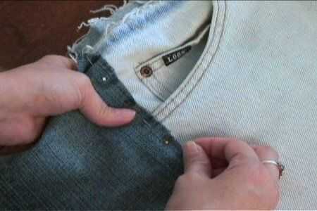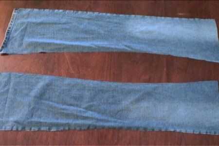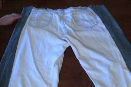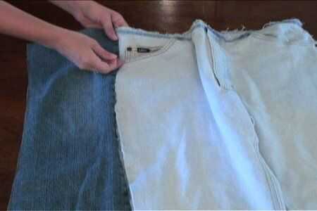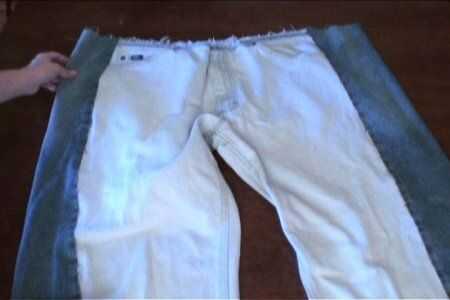 Con el siguiente par de jeans, con la longitud del primer par como guía, corte las patas de la parte delantera de los pantalones vaqueros. Prender a los lados del primer par y cose en el.