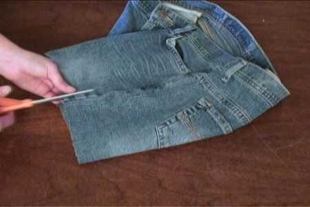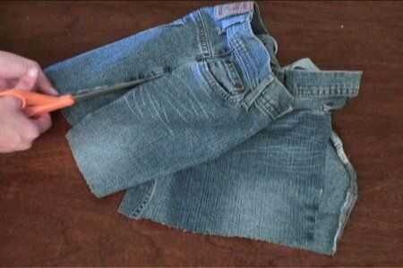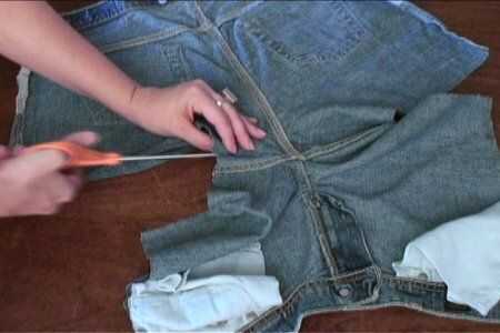 Ahora toma el segundo par y cortar las partes restantes de las piernas. Con los cortos que acaba de realizar, corte hacia abajo de cada lado y por el medio, para que la parte delantera y trasera son dos piezas separadas.