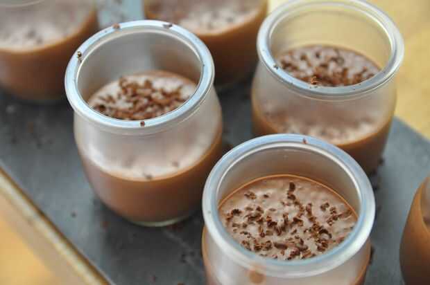 - Coloque la mezcla suave en tarros de porción. Decorar con semillas de cacao o virutas de chocolate.