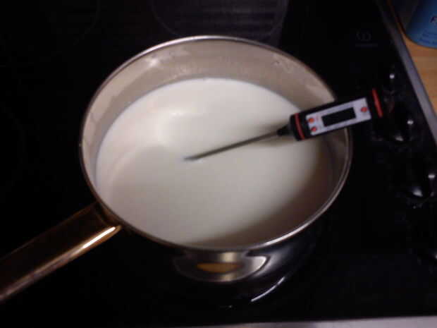 Mezcla el cuajo a la leche durante al menos 30 segundos. Dejar la leche, fuera del fuego, por al menos 20 minutos para cuajar.