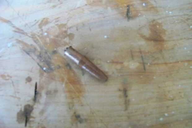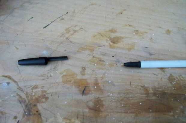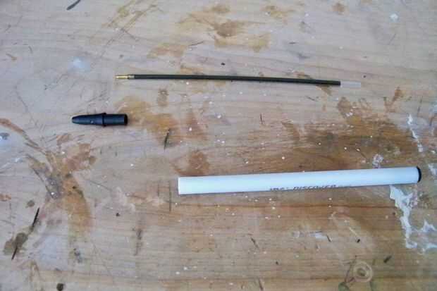 Ahora para el proyectil. Saque el lápiz barato. (Foto 1) Ahora que como estaba sólo usé mis dientes para sacar el final de la pluma. (Foto 2) Tomar la punta de la pluma y un poco de arena por la parte inferior. (Foto 3) Sray de pintura la punta del pin bronce y tu listo para armar la bala.