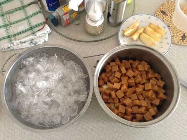 Quite las envolturas plásticas de los cuadrados de caramelo y poner los caramelos abiertos en su bowl/recipiente.