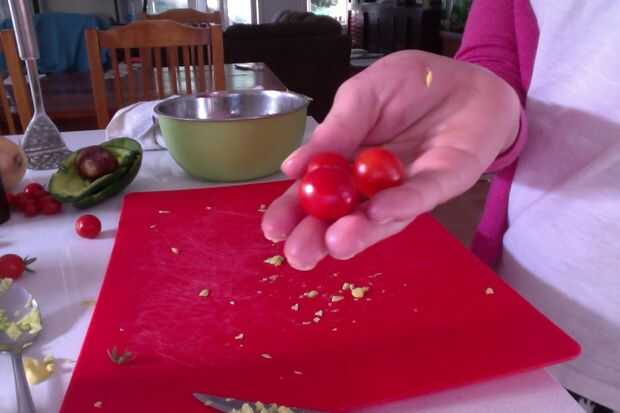 Luego cortar en cuadritos los tomates cherry, me gusta salir mina un poco grueso pero.