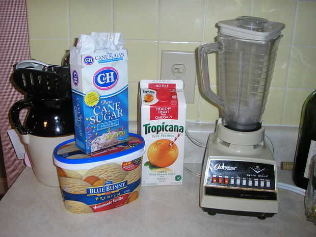 este es un batido muy SIMPLE 2 ingrediente. Esto se ha dicho al gusto como una naranja Julius. Hace una gran bebida para brunch o cualquier ocasión!Paso 1: Reunir los ingredientes:3/4 taza jugo de naranja (exprimido fresco es mejor pero supongo que t