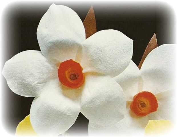 Cortar un trozo de papel crepe anaranjado, (igual que las instrucciones para el narciso trompeta.) Luego sumergir un pincel en pintura o tinta escarlata y toque suavemente los bordes cortados de la trompeta, hasta que los bordes estén ligeramente escarlatas (no sog ellos!) Que esta tinta o la pintura seca antes de continuar para el narciso.