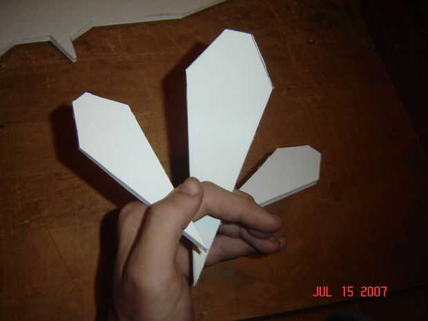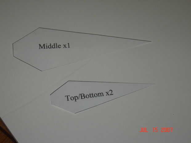 Ok ahora esta es la parte más difícil y más largo. Toma las plantillas proporcionadas y recorto. A continuación traza una de las plantillas grandes y 2 pequeñas teplates en el cartón pluma. Cortar la forma de formas el cartón pluma; deberás acabar con 1 pieza grande y 2 pequeños. A continuación, trace 1 uno pequeño en la parte superior del grande, mismo para el otro lado. Luego pegar un pequeño trozo en la pieza grande de cada lado. Deje que se seque, y el siguiente paso a seguir con la cuchilla.