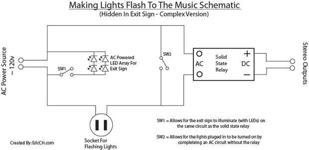 Luego podemos usar esta fluctuación del voltaje de C.C. en el cable del altavoz para activar un relé que operará a un voltaje mucho más fuerte al poder cientos de luces que parecen funcionar en perfecta cadencia de la música. (Es en realidad un pequeño retraso, pero es imposible para la vista humana acercarse incluso a detectar en tiempo real).