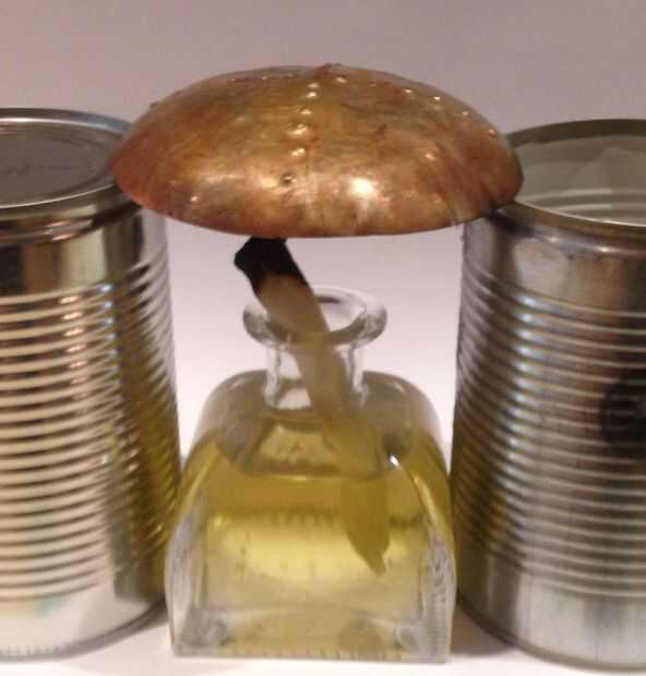 Para apoyar el recipiente de cobre sobre la llama usé dos latas antiguas, pero puede utilizar cualquier cosa que es la altura correcta. A continuación, puede dejar el recipiente suspendido por encima de la lámpara y deje que el humo se acumulan. No haría esta dentro ya que está algo ahumado y podría emprender su alarma de humo.