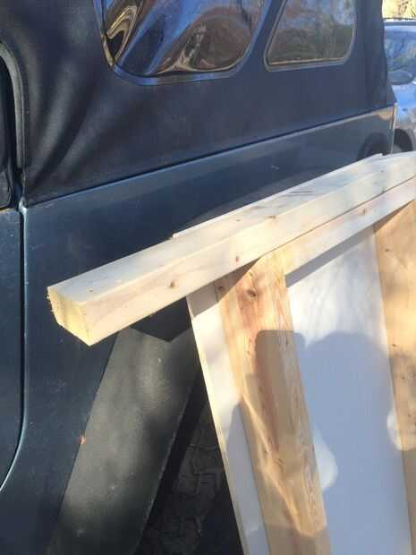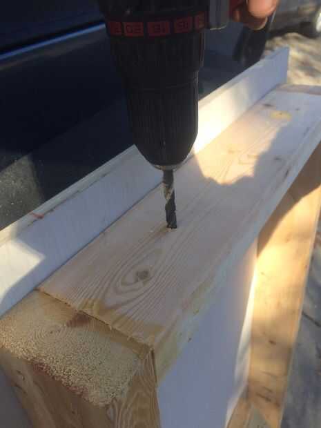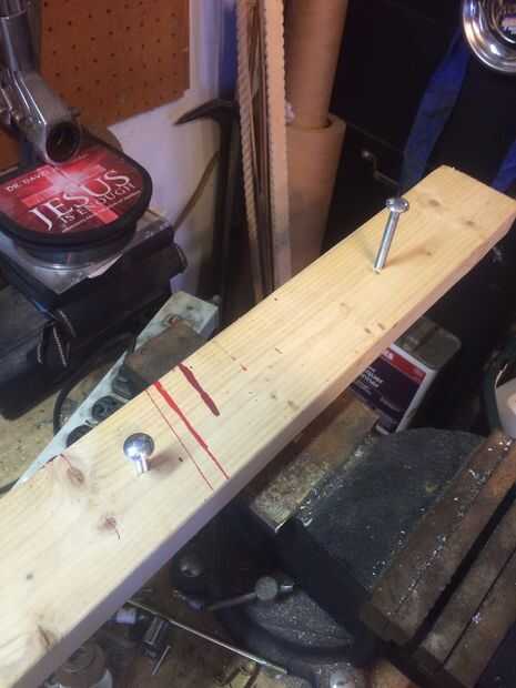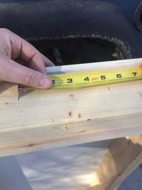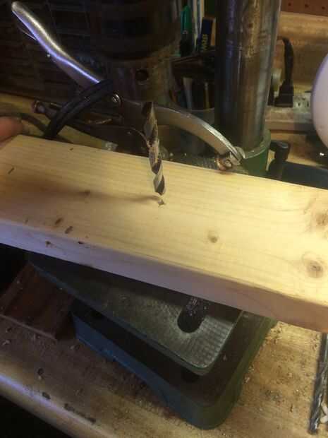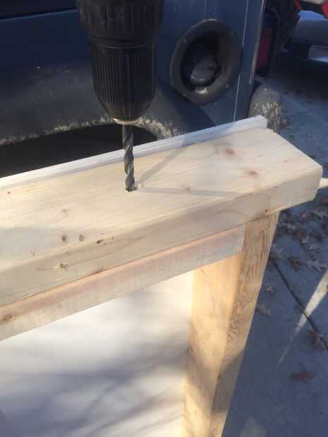 Poner un 2 x 4 en la final de la Junta de atento no-pierna y marcar para que su longitud podrá ser de cubierta de la Junta. Corte la tabla y encontrar su centro en la parte 4". Medir 5" a la izquierda y derecha del centro y haga una marca. Medida 1 3/4" de la parte superior de la Junta en las marcas de la izquierda y derecha. Haga una marca en la marca izquierda y derecha. Use un taladro para perforar agujeros de 5/16" en cada una de las marcas.