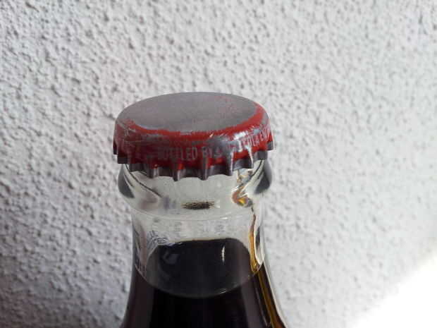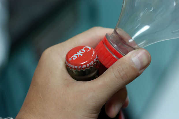 Toma su botella de coca cola de vidrio y despegar suavemente la tapa de la botella (se necesita la tapa para volver) Arena por toda la parte superior de la tapa de la botella y menos en los lados para que se vea más rústico. Esto puede hacerse antes o después de retirar la tapa.