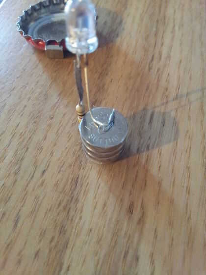 Pegamento o cinta adhesiva esta combinación de la luz del LED, pilas de botón y la resistencia a la parte inferior de la tapa de la botella.