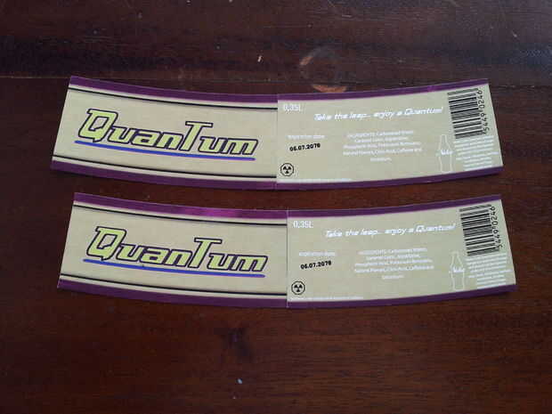 (Opcional) ir a esta página web: http://whatpayne.deviantart.com/art/Nuka-Cola-Quantum-label-106603029, impresión y pegamento o cinta adhesiva en la etiqueta. Llene la botella con agua, dejando aproximadamente una pulgada de aire desde la parte superior. Poner 3-5 gotas de colorante azul que el agua gire una luz o media sombra de azul.