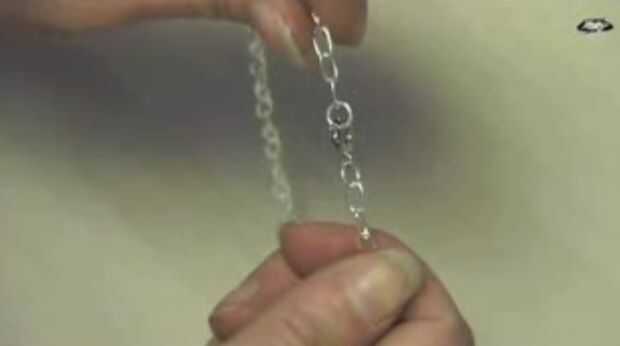 Medir 16,5" de la cadena y cortar por la mitad uniformemente. Colocar anillas a un extremo de cada pieza y la hebilla al ring de un salto. Sujete los dos lados.