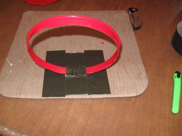 Bien, tiempo para sacar la cinta del conducto. Ahora, cortar 5 tiras del tamaño deseado, pero intente que sea aproximadamente de 5 a 6 pulgadas. Una vez que tengas todas las piezas de la cinta, pone uno en el centro de la llanta que usted simplemente recortar. Luego tomar dos más, y en los extremos de los bordes de la pieza de la cinta que sólo establecidas. Ahora esto no es necesario, pero es recomendable. Reforzar los pedazos de cinta que usted solo.