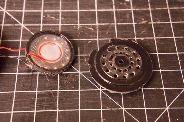 Uso de que cualquier medio es conveniente cortar a este tamaño (apenas más grande que el círculo de montaje de los altavoces); He montado la parrilla en un bloque de madera y utiliza una sierra del agujero, pero cortando con un par de tijeras para chapa trabajaría probablemente casi tan bien. Pegar los altavoces detrás de ellos cuando haya terminado.