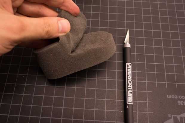 Tomar el cuchillo del exacto y corte las dos esponjas por la mitad, verticalmente, un poco más de la mitad. Hay muchas maneras de lujo para cortar espuma limpia, pero esto no va a ser vistos tan pequeños movimientos repetitivos funcionados bien.