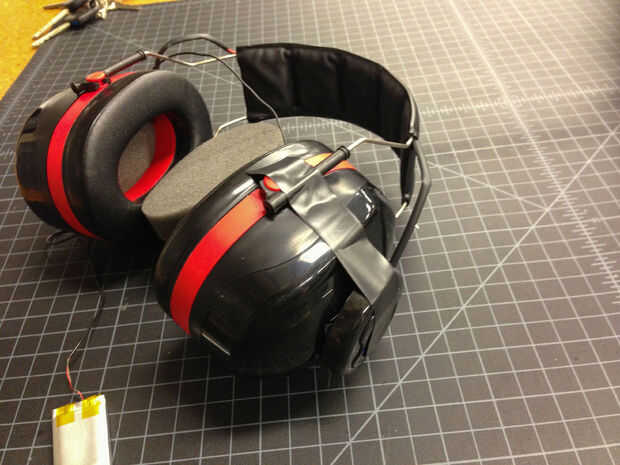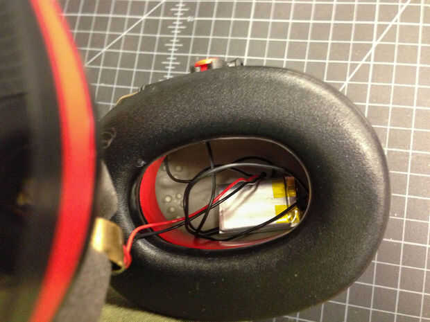 Coloque los altavoces dentro de la espuma, dejar caer la batería en la orejera derecha y meter cuidadosamente la espuma en su lugar; te tienes que poner de lado y retorcidos en su lugar.