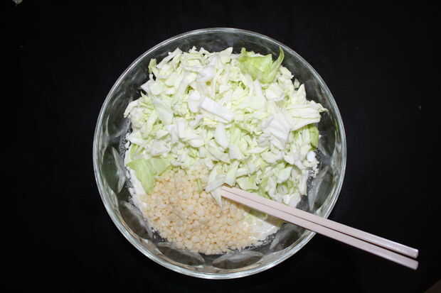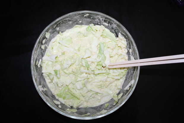 1) Añadir 100 gramos de harina en un tazón grande de okonomiyaki