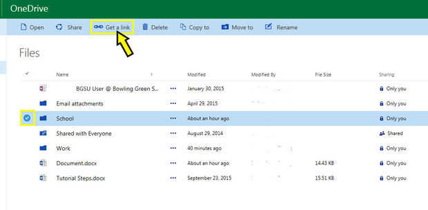 1. Si desea crear un vínculo que el destinatario puede utilizar para acceder a un archivo o carpeta, seleccione el archivo (o carpeta) como antes y luego seleccione el botón 'obtener un enlace' en la parte superior de la página.