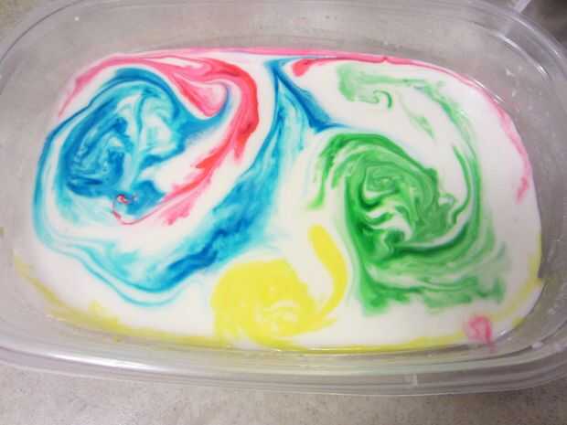 No es la mejor manera de obtener un color uniforme en todo. Para ello, debe teñir el agua antes de mezclar con la fécula de maíz. Mi forma de teñir el oobleck consiste en colocar un par de gotas de un color diferente en cada esquina y luego se arremolinan en la mezcla con mi dedo.