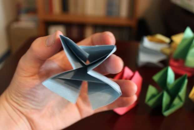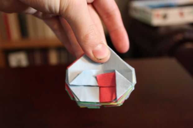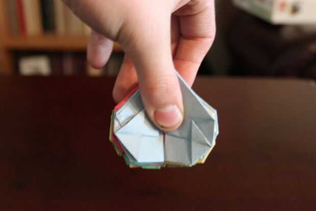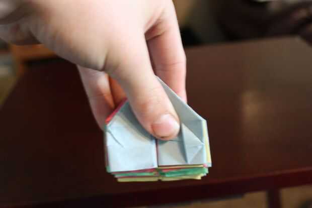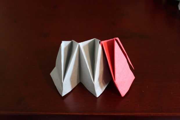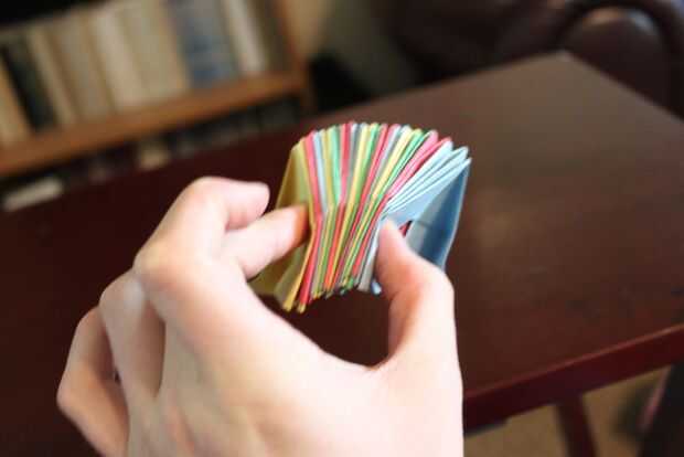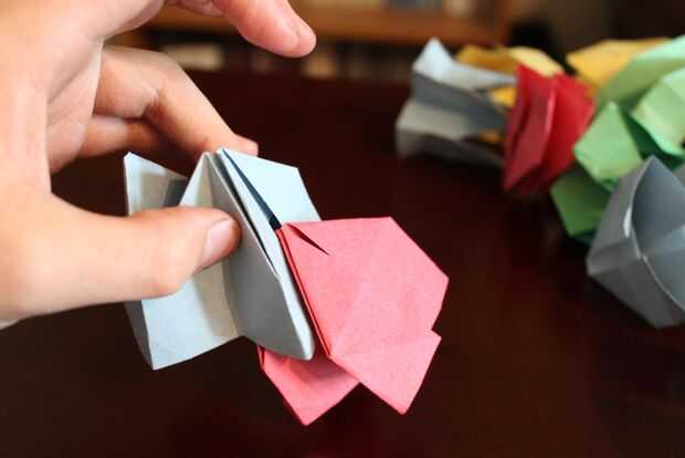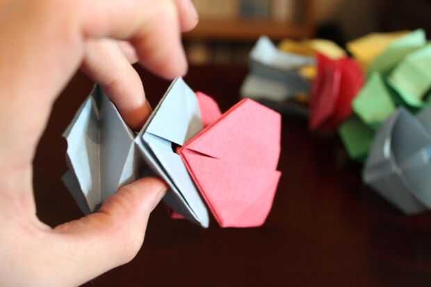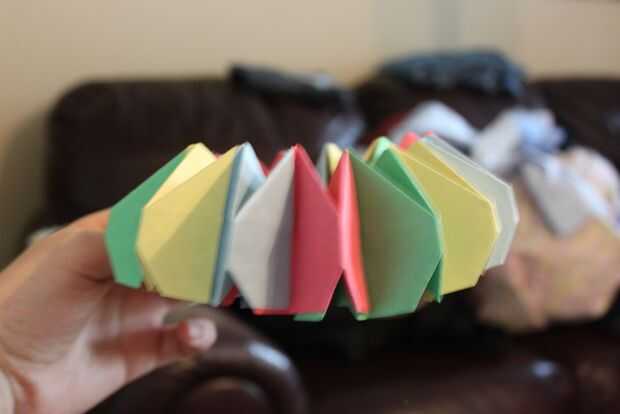 Tomar dos módulos, deslice las aletas de la parte inferior de un lado de uno en el centro de la otra. Mire bien las fotos. Conecte todos los módulos de esta forma hasta tener un largo y multicolor (si usas muchos colores) caterpillar-como cosa. Ahora a través de la cosa entera y volver a aplastar todas las aletas pequeñas y doble sobre. Volver a través y plegar todas las solapas que acaba de crear.