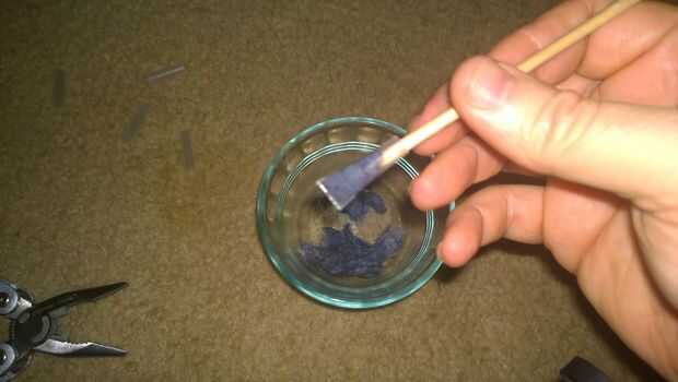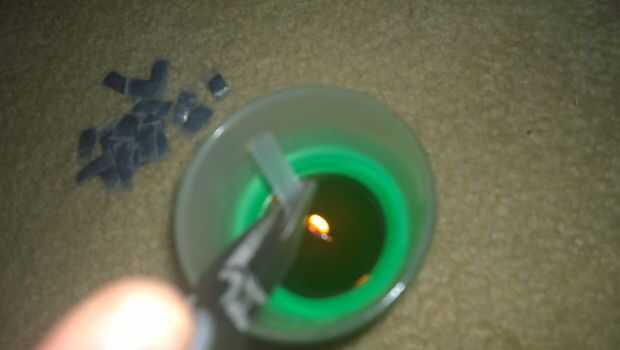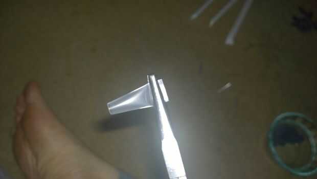 5. Sujete el extremo abierto de la paja en los alicates como hiciste antes. Mientras yo hacía esto, apreté la paja hasta que llegué el aire y el líquido adicional fuera de ella, pero no tanto que estaba totalmente seca.