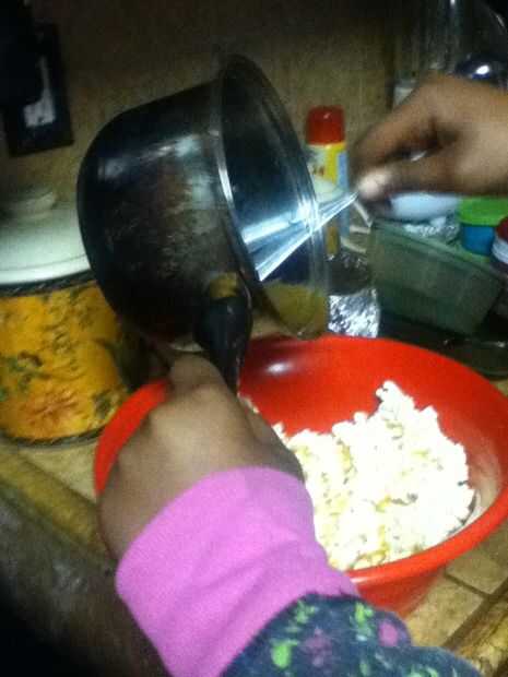 Despues se hace el dulce de leche, apagar el fuego inmediatamente y empezar a verter la salsa de caramelo en las palomitas de maíz.