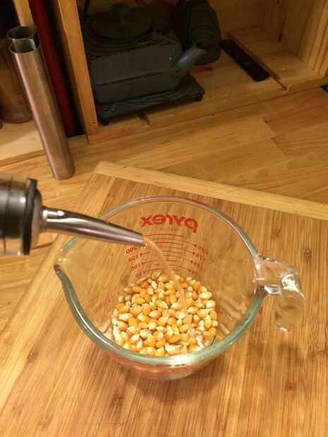 Esta sección de la receta ha sido probada con tocino clarificada, mantequilla, aceite de trufa, aceite de oliva, aclaró grasa de pato, aceite de coco, aceite de cacahuete y el aceite de linaza. Aunque cada grasa con sabor a contribuir con un poco de carácter al producto final, aceite de una viscosidad fina y de sabor neutro es la menos invasiva y mejor para aquellos que buscan un carácter de "clásico" palomitas de maíz. Agregar el aceite en este paso es mores una materia de la función de sabor; el aceite cubre cada núcleo individual y les permite hacer estallar uniformemente en el recinto de cocina.