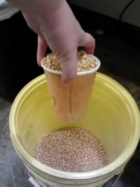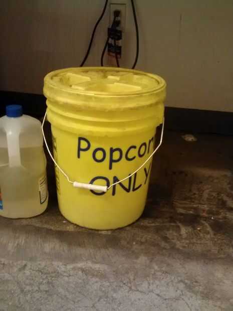 TechShop San José, usted puede encontrar nuestros granos de maíz almacenados en un balde de 5 galones de color amarillo brillante (alimentos seguros) justo debajo de la mesa de las palomitas de maíz junto con el aceite vegetal.