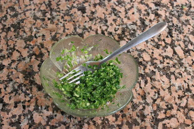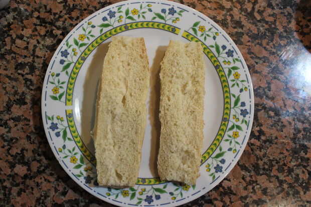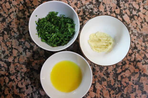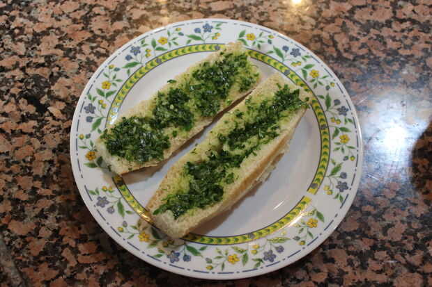 -Cortar el pan, cortar el pan a lo largo. -Combine el ajo, perejil y mantequilla. -Unta la mantequilla sobre cada mitad de pan. -Hornear durante 8 minutos hasta que ligeramente tostadas.