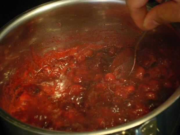 Coloque los frutos escurridos en una olla mediana con 1/2 taza de azúcar granulada.  Cocine a fuego medio hasta que las bayas son suaves, encogida y arrugados y los jugos se cuajó ligeramente.