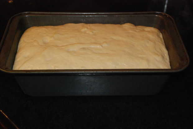 Volver la masa (ahora en la bandeja de pan) a la agradable cálido se sentó cuando se levantó la primera vez.  Permita que la masa aumente a cerca de 1/4 a 1/2 pulgada desde el borde de la olla, unos 45 minutos a una hora.