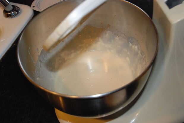 300 golpes si hacerlo a mano, 2 minutos a media velocidad si usando una batidora eléctrica como lo hago. Masa se ven algo fina (como masa de torta), pero no pánico, que es cómo debe mirar.