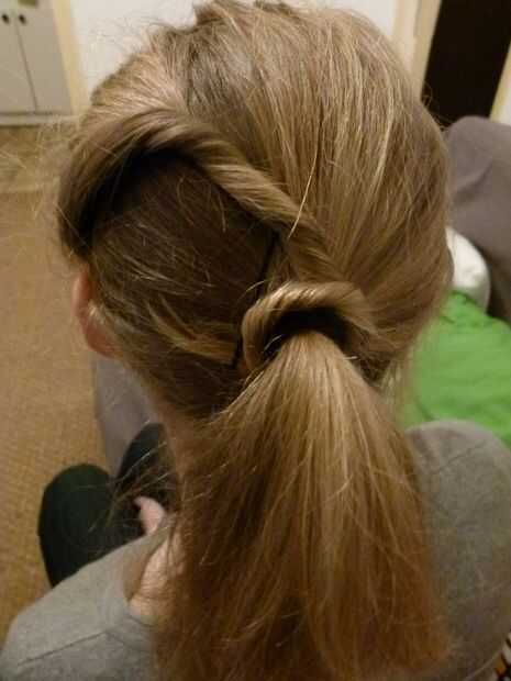 , Con la parte izquierda, haga un giro (o con el filamento de la derecha si lo prefiere). Viento el giro alrededor del elástico de su cola de caballo. Fijar la torcedura con horquillas para el pelo. Y si lo hace que el elástico se oculta bajo su toque, es más bella.