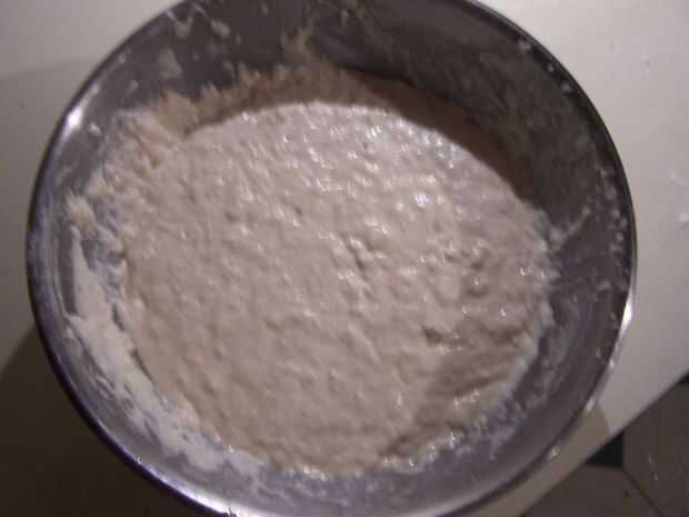 Comenzar mezclando el agua caliente y la harina. Luego, añadir 2 cucharadas de azúcar, 2 cucharadas de aceite, 2 cucharadas de levadura y 2 cucharadita de sal.