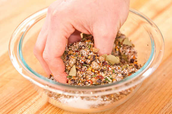 Para un vientre 5 libras de carne de cerdo, recetas más fiables que encontré llaman para 1/4 taza de sal kosher y la rosa 1 cucharadita de sal (también conocido como sal de curado). Puesto que el equilibrio de la sal a la proteína puede ser delicado cuando se trata de lograr una cura adecuada, mantenía a estas cantidades. Adición de una variedad de ingredientes fragantes a la curación básica infunde el vientre con sabor. Utilizar pimienta negra, azúcar morena, Romero, enebro, ajo, copos de pimiento rojo, laurel, tomillo y nuez moscada. Les mezcle minuciosamente para asegurarse de que están distribuidos uniformemente.