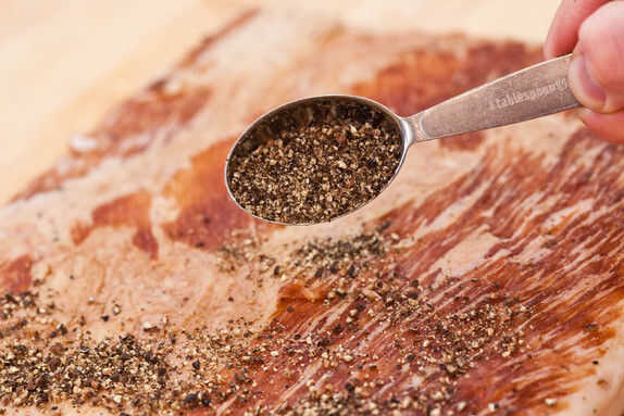 Con el lado carne de panceta hacia arriba y el lado largo frente a usted, espolvorea en 2 cucharadas grueso negro pimienta molida una adición típica antes de lanzar la panceta. La pimienta fresca agrega notas acres adicionales a la panceta final.