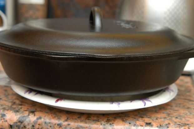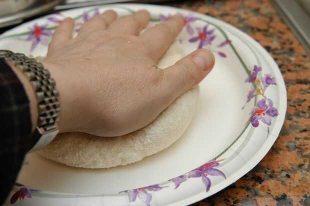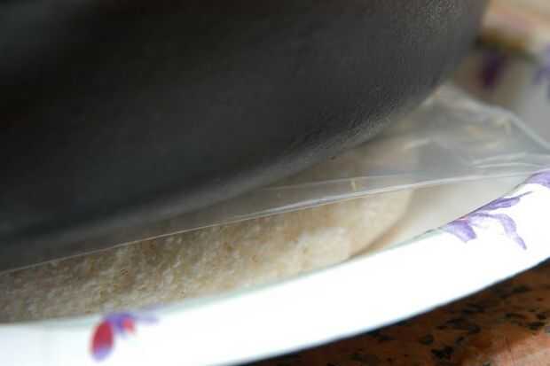 Poner el paño de queso relleno en un plato y aplanar con la mano, gantly que lo forma cómo le gustaría. Ahora lo pesan. Una sartén de hierro pesado es mi método, usted puede optar por utilizar otro plato apiladas con conservas, encurtidos, nada pesado.