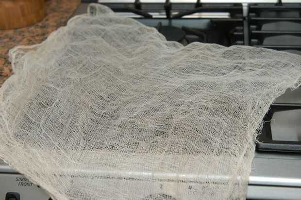 -Un pedazo de tela lo suficientemente grande como para forrar completamente el colador. I doble si el tejido se ve demasiado flojo. Si crees normal queso cottage deslizarse a través de los orificios, doble que. También puede utilizar suelto tejido muselina.