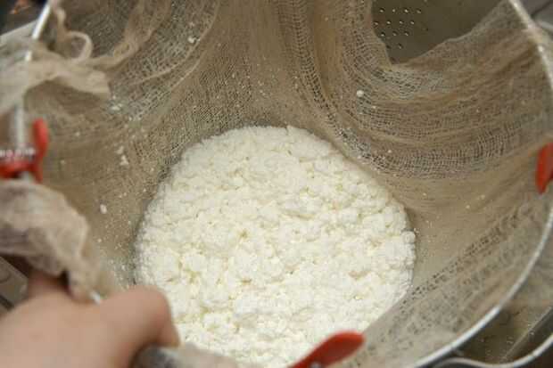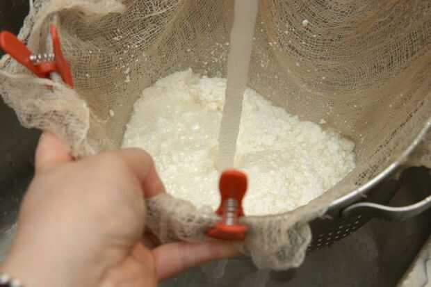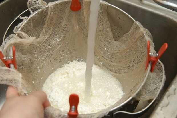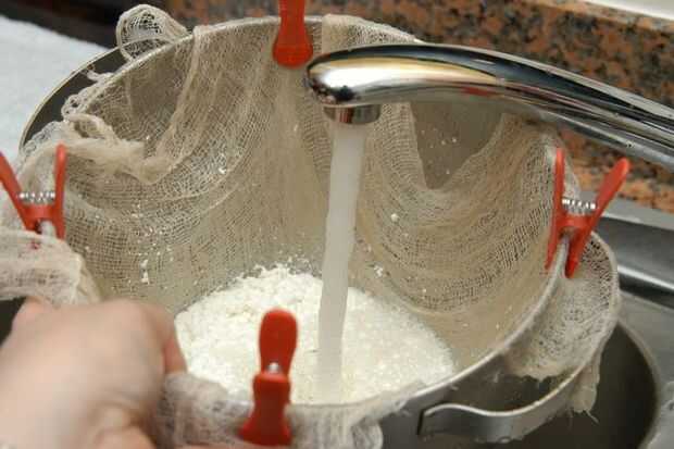 Deje correr agua fría sobre el queso mientras que todavía en el colador. El colador se mueven en un movimiento de remolino a la cuajada. Hacer esto hasta que salga limpia. Esto le llevará un minuto o dos. Sacuda el exceso de agua de la cuajada.