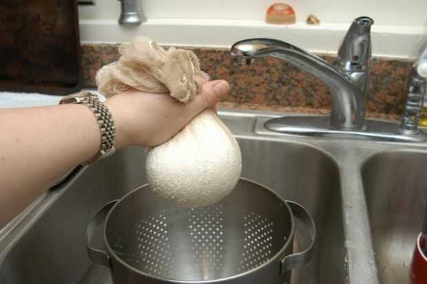 Las cuatro esquinas de la tela de queso suavemente Retire el colador, la pila de paneer fresco de elevación hacia arriba y afuera. Gire hacia fuera el exceso de agua. Va a crear una bola de esta manera.