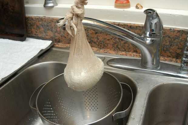 Encontrar un lugar seguro para colgar el paño de queso donde puede gotear por lo menos una hora, preferiblemente dos. Atar sobre el grifo es bueno, si usted no necesita el fregadero de la cocina por un tiempo.