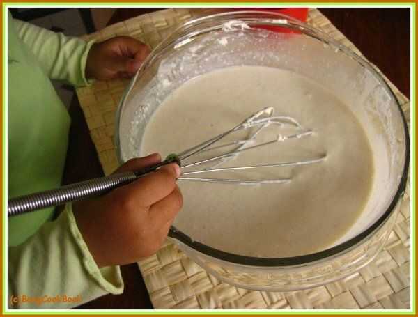 ingredientes:110g de harina,1 huevos,200ml de leche y1 cucharadita de mantequilla al cocinar los panqueques.Utensilios:Sartén,Tazón grande,Cucharada yEscalas de.Paso 1: Hacer la masa Primero pesar la harina, el huevo y la leche y vierta en el tazón.B