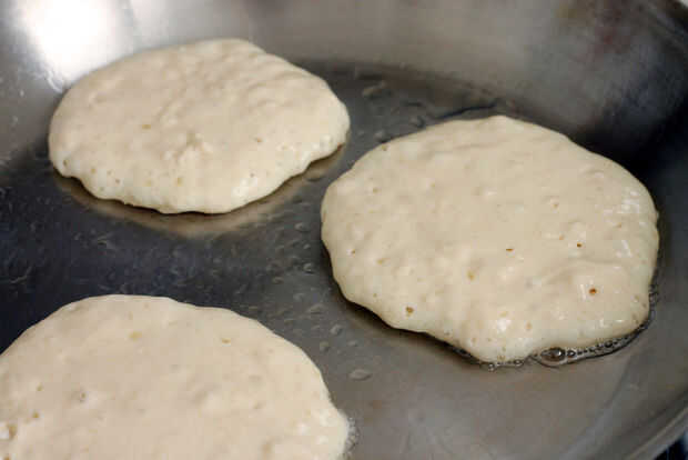 - Con una taza de 1/4 taza de medir, vierta la mezcla sobre la plancha, asegurándose de no masificar. Cuando panqueque fondos son de color marrón y superficie superior comienza a burbujear, 2 a 3 minutos, voltear tortas y cocinar hasta que restante lado ha dorado, 1 a 2 minutos más. Aceite a la sartén y repetir para el siguiente lote de panqueques.