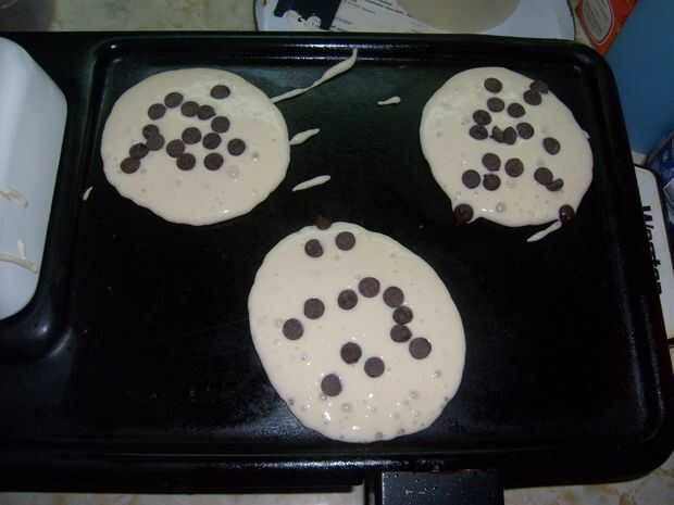 - Chocolate Chip Pancakes - agregue 1 taza de chocolate semiamargo a la masa una vez que los ingredientes se mezclan juntos. O si desea hacer algunos, espolvorear algunos chips de chocolate en la parte superior antes de que le da la vuelta.