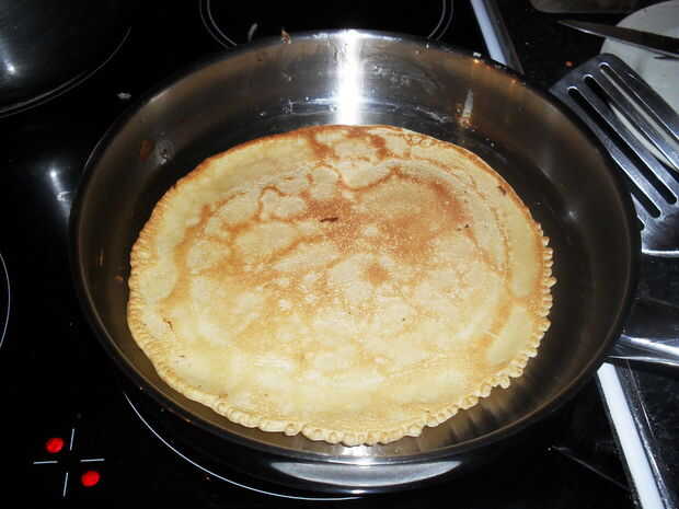 Levante cuidadosamente el borde de la crepe cocinado con una espátula para ver si es oro matizado como debe ser.